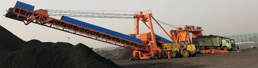 ![]() 1. belt conveyor system, 2. arm frame pitching system, 3. metal structure, 4. diesel engine unit, 5. electrical system, 6. upper train and door frame, 7. walking mechanism, 8. counterweight system, 9. hydraulic system, 10. arm frame rotary mechanism. ![]() Equipment Technical Specification 1).Process Flow :Bulk cargo transported by truck- -Feeder chute- -Feeding Belt conveyor- -Transfer chute- - boom conveyor--Material field 2). To meet environmental requirements, using water spray dustproof technology. The water spraying system is installed in the feeder chute, the transfer chute and the boom discharging point to control dust. Water tank set capacity is 6 cubic meter, can be adjusted according to the actual situation; 3). Boom belt conveyor provided with pitch function and slewing function , fixed-point stacking material tonnage is about 4000 ton, to handle 4 million tons ocean vessel it only need to move ten times; 4).Equipment with self-moving function, using a full drive mode of moving, wheels can be rotated at the same time and also rotated separately, so it can move forward and backward, translation around, in-situ rotation and other multiple degrees of freedom of action. Rapid displacement can be achieved in the process of stacking; 5). The driver room is set in front of the device, with wide view when operating, HD cameras are set on many places of device, The driver can grasp all conditions around the equipment and work condition by means of monitor; 6). The belt conveyor drive motor and the traveling motor all adopt the frequency conversion motor, can adjust its operating speed according to the actual loading condition; 7). Device Set up Truck Dual Lane , to reduce truck waiting time, and greatly improve working efficiency; 8).Feeding model : trucks(<60 tons), loading vehicles(<10tons) 9). 40tons-truck running time is 60s, one-hour cycle 60 times, device effective work efficiency is 2400t/h; Maximum allowable truck overload is to 60 tons, productivity instantaneous peak is 3600t/h.